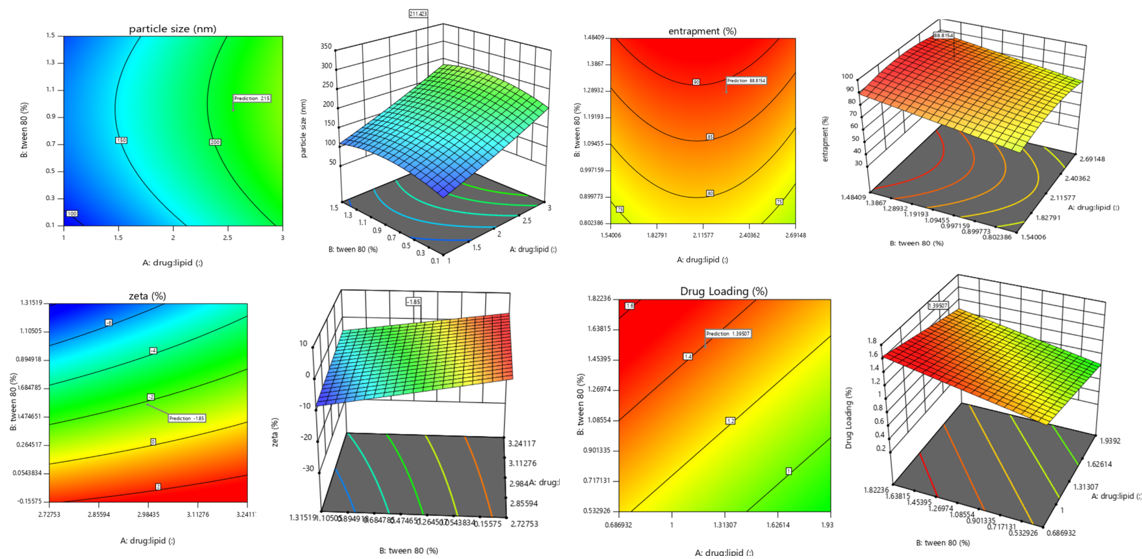 Fig. 2: Three-dimensional and two-dimensional structure of particle size (a), Entrapment Efficiency, (b) and zeta potential, (c) drug loading capacity (d), Note-2D and 3D graph generated from Design Expert of all variables, which indicated optimized variables with their values