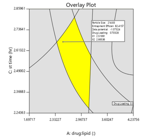 Fig. 3: Contour plots of desirability for the optimized CC-SLNs, note-overlay plot generated form design expert, shows yellow region finding of optimized batch with values