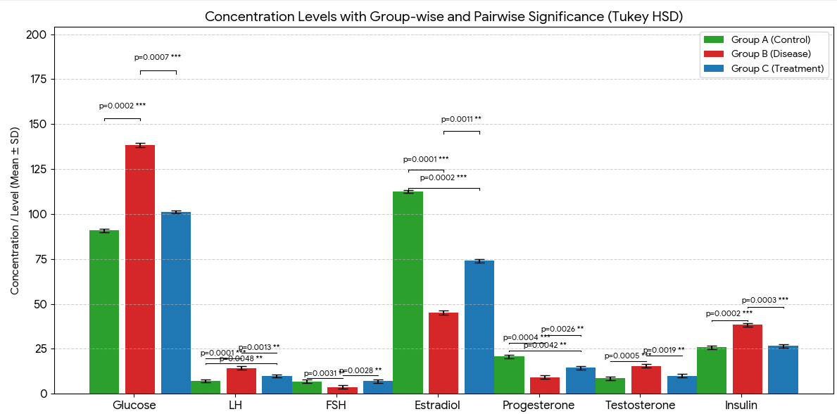 Disease induced significant hormonal and metabolic alterations, which were partially reversed by treatment. Glucose (A: 90.81±0.97; B: 138.33±1.03; C: 101.17±0.92, p = 0.0002 ***) was significantly elevated in disease and reduced toward control levels with treatment. LH (7.08±0.89; 14.27±1.02; 9.89±0.84, p = 0.0001 ***) and insulin (25.78±0.99; 38.31±1.04; 26.59±1.01, p = 0.0002 ***) showed similar trends. FSH (6.86±0.90; 3.65±0.98; 7.01±0.88, p = 0.0035 **) and estradiol (112.52±0.95; 45.23±1.10; 73.98±1.03, p<0.0001 ***) were suppressed in disease and partially restored by treatment. Progesterone (20.82±0.98; 9.24±1.01; 14.55±0.94, p = 0.0007 **) and testosterone (8.65±0.91; 15.49±1.07; 10.09±0.88, p = 0.0005 **) also followed similar patterns. Shown in fig. 8 and table 7. These findings indicate that disease markedly disrupts endocrine and metabolic homeostasis, while treatment effectively normalizes most parameters.