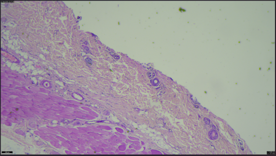 Skin responses were monitored using a refined Draize scoring system, assessing erythema and edema at 1, 24, 48, and 72 h post-patch application, with scores classified according to a standard primary irritation index (PII) scale where scores between 0.0–0.5 denote non-irritating and 0.6–1.2 minimally irritating effects in rodents [56]. Hormonal parameters-including LH, FSH, fasting insulin, and glucose, were analyzed at 72 h. In parallel, skin biopsies collected at 72 h underwent H and E staining to evaluate histopathological alterations such as epidermal integrity, dermal inflammation, and structural changes. As shown in image 9. Together, these assessments provided a comprehensive evaluation of both dermal safety and systemic hormonal effects following SLN loaded transdermal patch application.