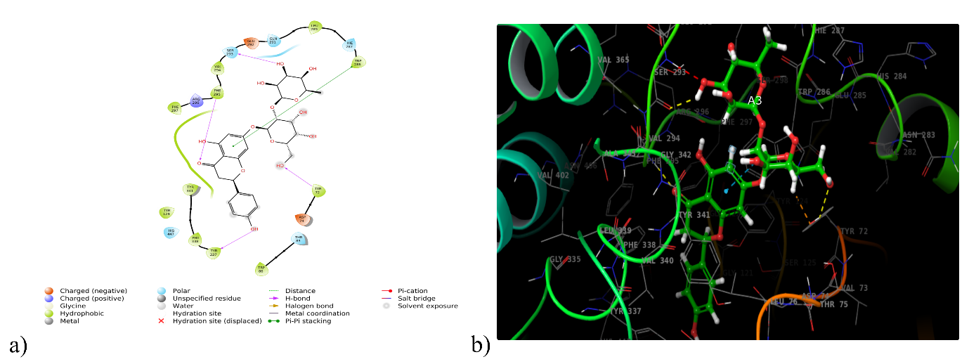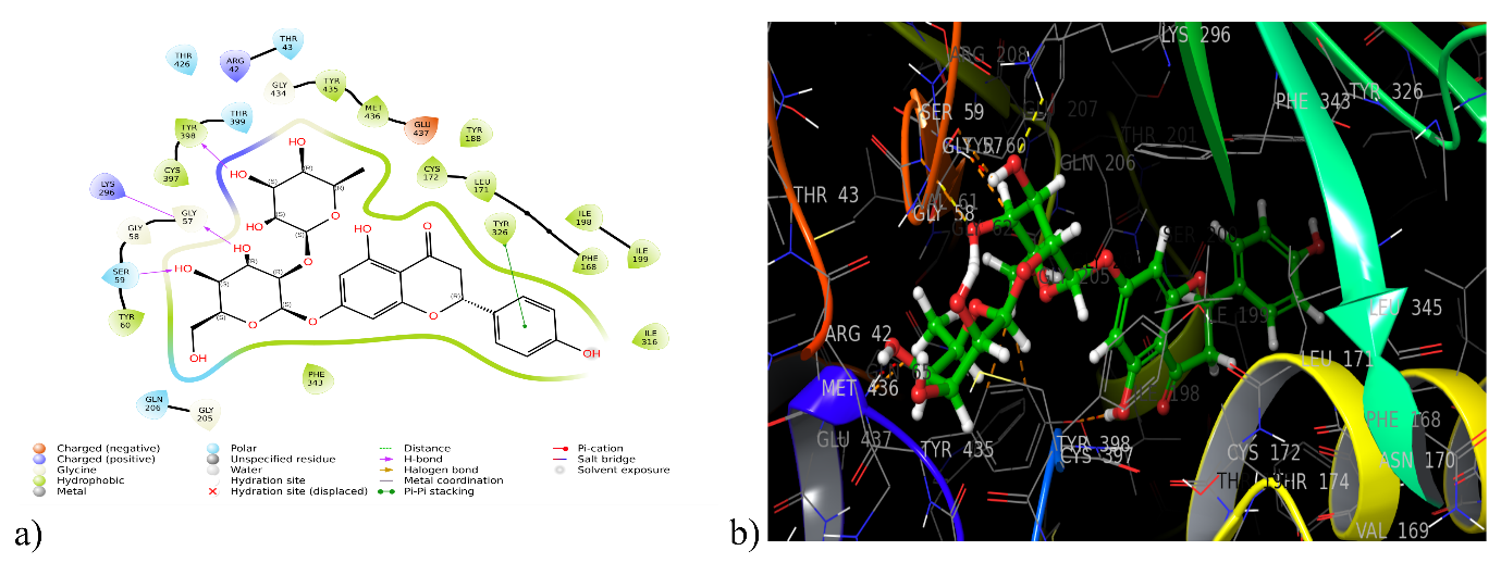 These findings confirm a positive correlation between molecular docking results and the in vitro acetylcholinesterase inhibitory activity. According to a literature survey, the highest docking score, DQ5 (naringin), improved long-term potentiation and restored learning and memory deficits caused by Alzheimer's disease [63].