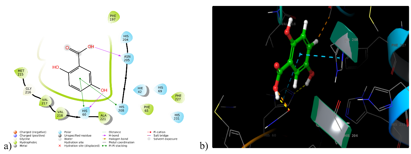 Five phytoconstituents (DQ1, DQ2, DQ4, DQ6 and DQ7) could dock into the active domain of the tyrosinase enzyme (5I38) with a remarkable binding affinity, with docking scores varied from -5.56 to -3.40 kcal/mol. Compound DQ1 displayed the highest binding score (5I38) with a docking score of -5.56 kcal/mol, whereas the co-crystal kojic acid showed -7.15 kcal/mol. Compound DQ1 (3, 4-dihydroxy benzoic acid) exhibited hydrophobic interactions with Ala221, Phe197, Phe227, Phe65 and Met215, as well as hydrogen bond interactions with Asn205 and His60. Furthermore, it established polar contacts with the tyrosinase protein active site's amino acid residues His231, His69, Hie42, His208, Asn205, His204 and His60. A Glide XP docking validation study reported that the reference ligand (kojic acid) reproduced its experimental binding pose with an RMSD of 0.132 Å. This is well below the commonly accepted ≤ 2.0 Å threshold, supporting that the docking protocol for 5I38 would be considered validated. The 2D and 3D interactions between DQ1 and the tyrosinase enzyme (5I38) are depicted in fig. 3 and table 1.