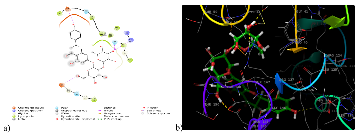Antioxidant activity can be measured by examining the interactions with the enzyme peroxiredoxin (1HD2). DQ5 (naringin) scored the greatest docking score (-6.644 kcal/mol) with 1HD2, and hydrogen bonding was attributed to the amino acids Asp113, Asp145, Thr44, and Arg127. Whereas, hydrophobic interactions were linked to Cys47, Pro40, Pro45, Phe120, Ile119, Leu116, Leu112, and Leu149 and polar interactions with Thr44 and Ser115 (fig. 4). It exceeded co-crystal benzoic acid's docking score of 5.506 kcal/mol (table 1).