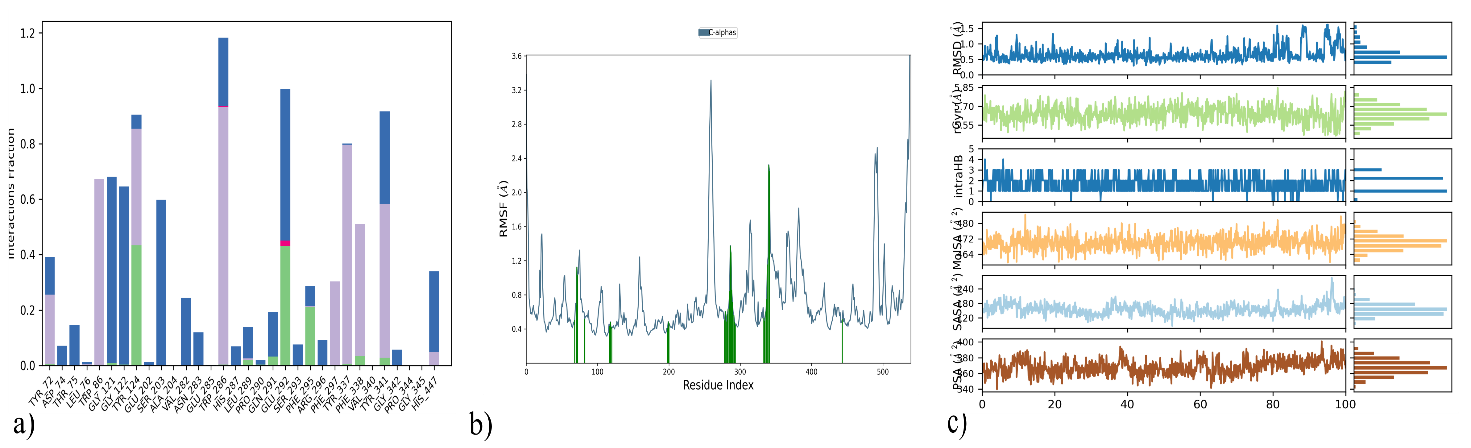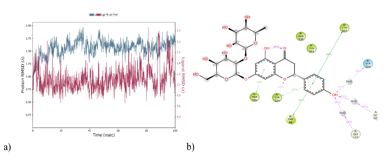 The extra-precision docking findings are validated by carefully grading the ligands according to their binding free energies and calculating the binding free energy of the ligand-protein complexes using the MM-GBSA approach. The ΔGbind values of the enzymes acetylcholinesterase (6O4W) and human peroxiredoxin (1HD2) ranged from-29.69 (DQ1) to-86.49 kcal/mol (DQ5) and-29.95 (DQ1) to-68.26 (DQ5) kcal/mol, respectively. The binding free energy (ΔGbind) scores with the acetylcholinesterase enzymes revealed that the best-interacted molecule DQ5 (naringin) (-86.49 kcal/mol) had better binding energy than the co-crystal donepezil (-77.91 kcal/mol) and benzoic acid of the human peroxiredoxin enzyme (-26.55 kcal/mol) (table 1).