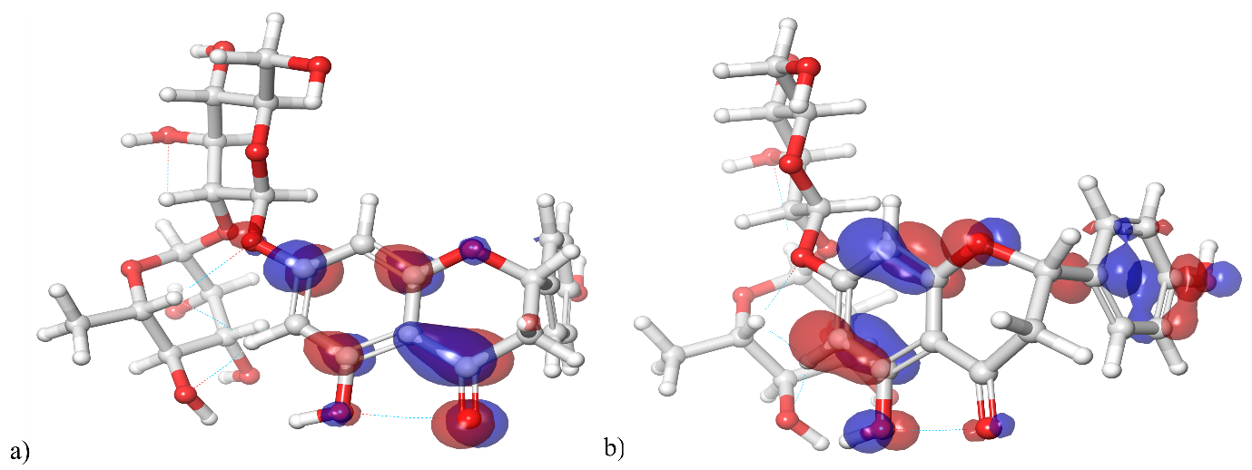 Studies using density functional theory (DFT) concentrate on geometric optimisation, which predicts the best stable molecule structure by minimising the system's energy [47]. This allows bond lengths, bond angles, and dihedral angles to be calculated. DFT is a computational quantum chemistry and materials science technique investigating molecules' electronic structures and characteristics. The B3LYP functional (Becke's three-parameter hybrid functional with Lee–Yang–Parr correlation) and the 6-31G (d,p) basis set were used to geometrically optimise the DQ5 (naringin) molecule of the Jaguar module of the Schrödinger software. Electrostatic potential maps (ESP) were also produced for every molecule. The frontier molecular orbitals, including the highest occupied molecular orbital (EHOMO) and others, were used to determine quantum chemical parameters, including the energy gap (ΔEGAP), dipole moment (μ), hardness (η), and local softness (σ) and the following equation.
