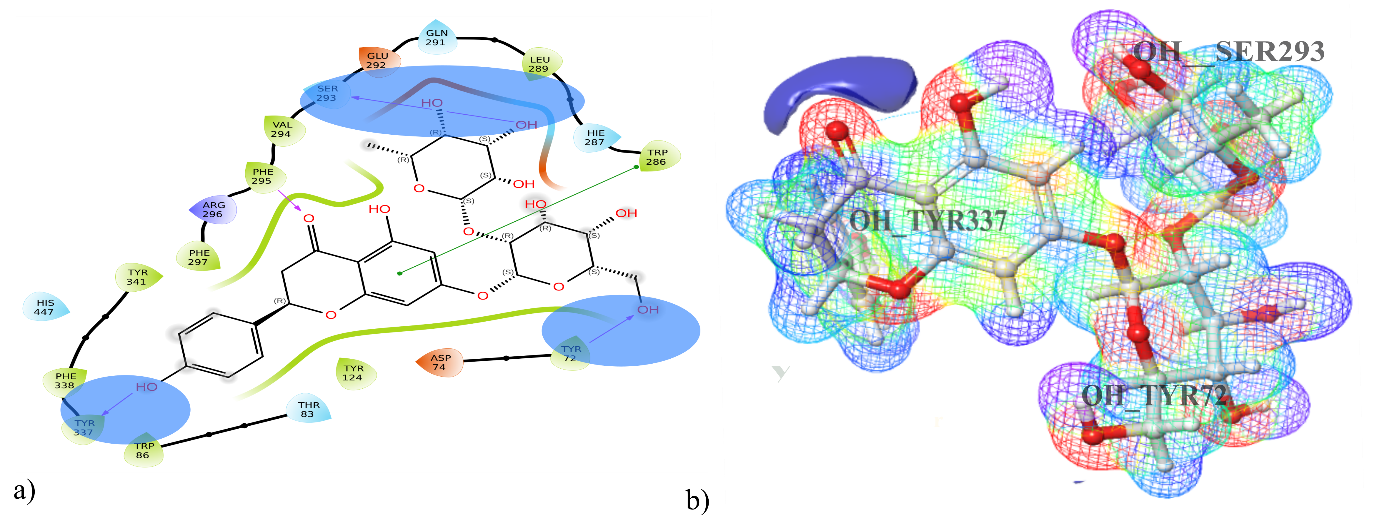 With an impressive binding affinity, every phytoconstituent could be docked into the acetylcholinesterase (6O4W) protein's active site with docking scores ranging from-14.182 to-2.498 kcal/mol(table 1). With a docking score of-14.182 kcal/mol, compound DQ5 (naringin) demonstrated outstanding binding with 6O4W, beating the co-crystal donepezil (-9.54 kcal/mol). Compound DQ5 demonstrated hydrogen bond interactions with Ser293, Phe295, Tyr72, and Tyr337 and hydrophobic interactions with Trp286, Leu289, Val294, Phe295, Phe297, Tyr341, Phe338, Tyr337, Trp86 and Tyr124. Additionally, it formed polar interactions with the amino acid residues Hie287, Gln291, Ser293, His447 and Thr83, and pi-pi stacking with Trp286 of the acetylcholinesterase protein active site (table 2). Fig. 1 shows the 2D and 3D interaction of compound DQ5 with acetylcholinesterase enzyme (6O4W).