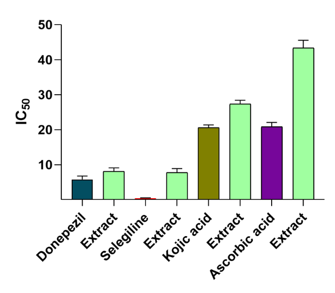 Acetylcholinesterase, MAO-B, Tyrosinase inhibition test and hydrogen peroxide free radical scavenging effects of DQ extract