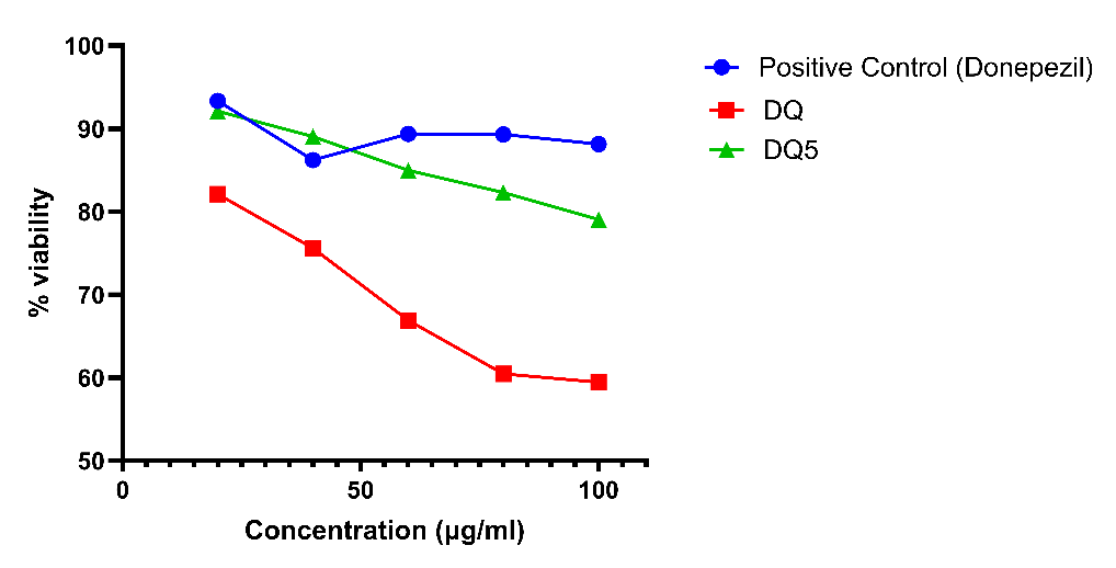 The MTT assay evaluated the impact of DQ extract and DQ5 (naringin) on scopolamine-induced neuroblastoma SH-SY5Y CRL-2266cells [62]. Scopolamine is used to induce cellular stress in the seeded SHSY5Y cells. 100 µl of DMEM supplemented with FBS was used to plate 10,000 SH-SY5Y cells per well in 96-well plates. For the blank wells, 100 µl of DMEM supplemented with FBS was added without any cells. DQ extract and DQ5 (naringin) concentrations were 20, 40, 60, 80, and 100 μg/ml. 20 μl of MTT reagent (5 mg/ml) was added after 24 h of incubation at 37 °C with 5% CO₂, and the mixture was then incubated for 4 h. The results were expressed as a percentage growth in each well compared to control cells cultivated without the standard/DQ. After dissolving formazan crystals in DMSO, the absorbance at 550 nm was measured. The following equation was used to compute relative cell viability: Cell viability (%) =