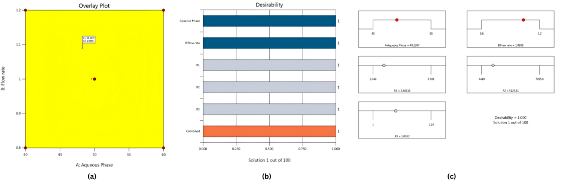 A Plackett–Burman design with five factors (aqueous phase percentage, flow rate, column temperature, wavelength, and injection volume) over 12 runs identified CAAs such as Rt, Tf, and NTP. Plackett–Burman design was selected for its ability to rapidly pinpoint the most influential factors from a set, while requiring only a minimal number of experiments. For further optimization, a CCD design was used with an aqueous phase (40–60%) and flow rate (0.8–1.2 ml/min) over 13 runs [22, 23]. CCD was chosen for its capability to capture both linear and nonlinear effects, enabling a more robust and efficient optimization process with fewer experimental runs. Regression analysis employed a second-order polynomial model incorporating only statistically significant terms (p<0.05) to develop the predictive equations. Response surface plots and numerical optimization identified optimal conditions targeting an Rt of 2–4 min, Tf of 1–1.5, and NTP ranging from 5000 to 8000.