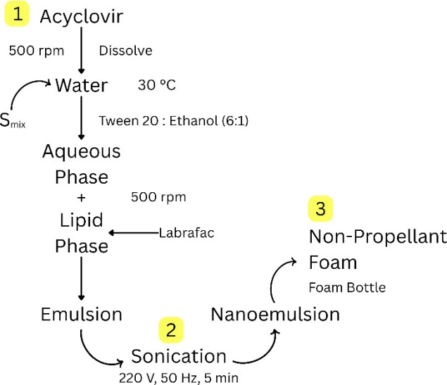 Fig. 2: Schematic representation of the formulation of NPF containing acyclovir. Steps (1) shows the scheme for the preparation of the emulsion, consisting of the aqueous phase (the drug Acyclovir, Smix and Water) while the lipid phase consisted of Labrafac; (2) sonication of the emulsion to form a nanoemulsion, and (3) filling the foam bottle with the nanoemulsion, which upon actuation will form the non-propellant foam