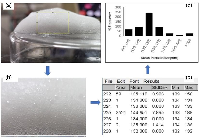 Fig. 4: Bubble size estimation of NPF; photographic images of the foam bubbles (a); digital image processing of the bubble size (b); analysed using ImageJ software (c); and bubble size distribution (d)