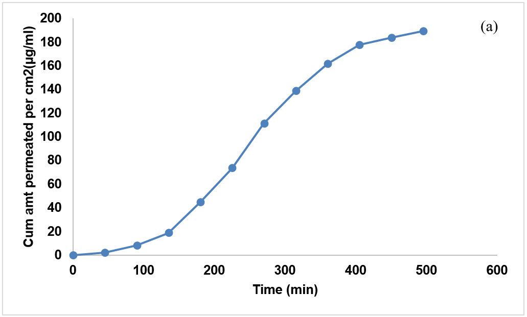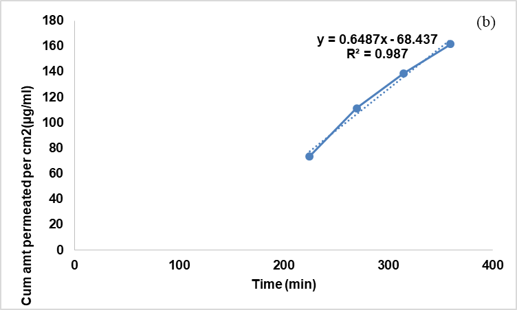 Fig. 5: Ex vivo permeation studies for NPF formulation (S5) using porcine skin for 495 min (a) and the plot of the linear portion of the permeation profile used in the calculation of the flux (b)