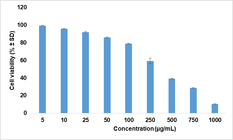 Fig. 6: Cytocompatibility of acyclovir NPF at the tested concentrations ranging from 5-1000 µg/ml, data are presented as mean±SD (n = 3)