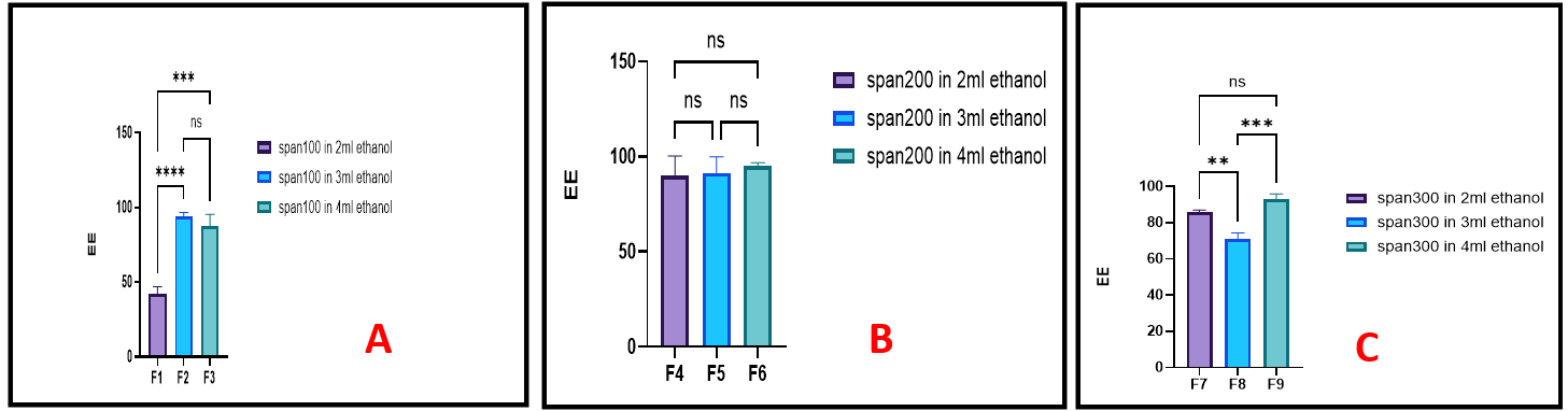 Fig. 1: The impact of ethanol volume on the entrapment efficiency of FLC-loaded spanethosomescontaining; (A) 100 mg Span 60, (B) 200 mg Span 60 and (C) 300 mg Span 60, (ns,*, ** and *** represent non-significant, P<0.05, P<0.01 and P<0.001 respectively), n=3, mean values±SD