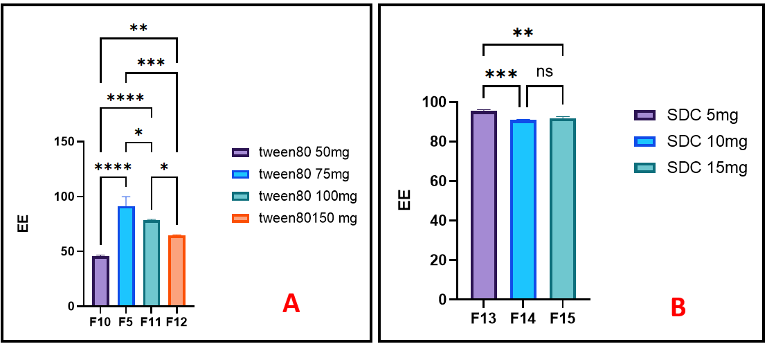 Notably, formulations F10–F15 were designed to directly compare the effects of Tween 80 and SDC along with their concentrations under identical conditions, while keeping all other components constant. As shown in fig. 2A, there was a statistically significant (p<0.05) increase in the drug EE% when the amount of tween 80 was increased. However, a notable decrease of the EE% was observed with further increases of tween 80 amounts (F12<F11<F5). The vesicular bilayer is softened by the addition of tween80, which increases the flexibility of the bilayer and thereby enhances the drug's permeation into vesicles. The incorporation of tween 80, a nonionic surfactant, enhances the flexibility of the vesicular bilayer, thereby facilitating improved drug incorporation into the vesicles. Nonetheless, at higher concentrations, tween 80 increases membrane fluidity to an extent that promotes drug leakage into the surrounding aqueous phase. This is likely due to its hydrophilic nature, which can compromise bilayer integrity and reduce overall entrapment efficiency [23].