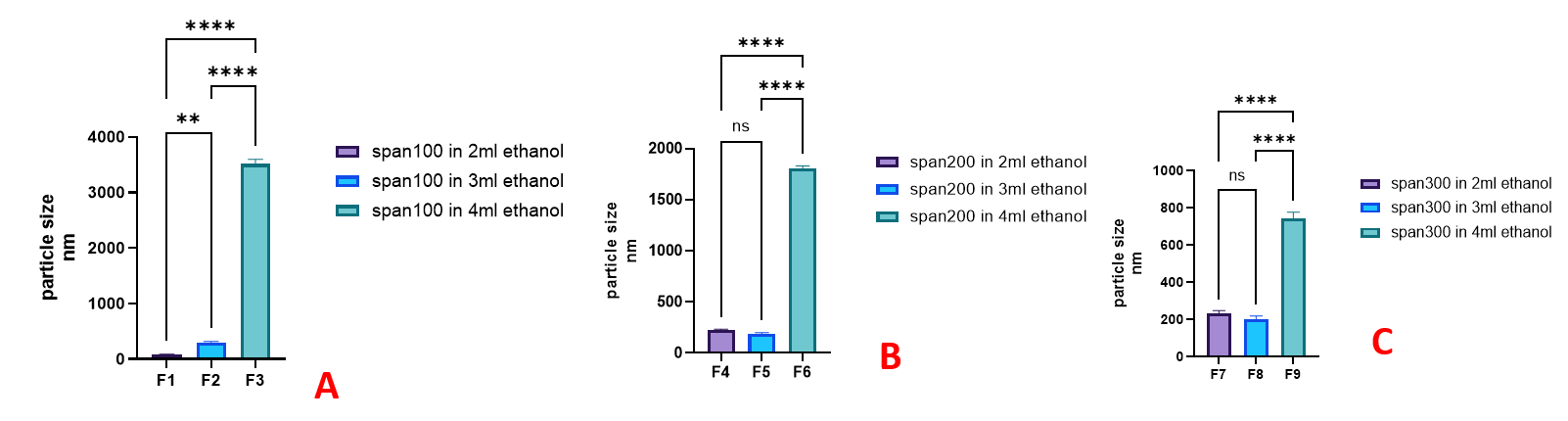 Fig. 3: The impactof ethanol volume on FLC-loaded spanethosomes vesicles size at three level of span 60;(A) 100 mg, (B) 200 mg and (C) 300 mg, (ns,*, ** and *** represent non-significant, P<0.05, P<0.01 and P<0.001, respectively), n=3, mean values±SD
