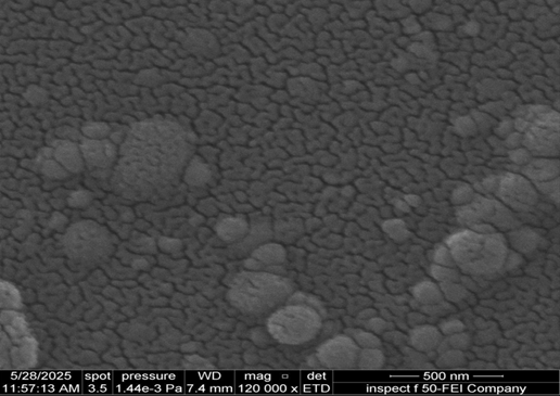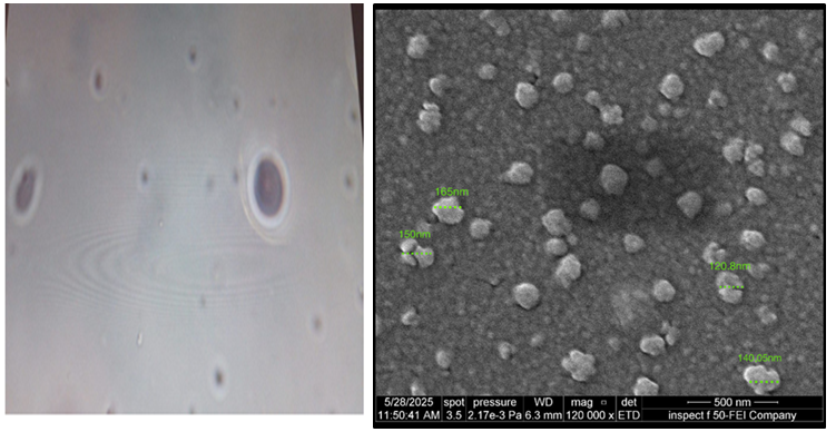 Microscopy photo (fig. 10, left) confirmed the presence of spherical vesicles with a well-defined outer boundary. The dispersion appeared uniform, with no signs of aggregation. Additionally, the SEM imaging (fig. 10, right) supported these findings, revealing smooth, discrete vesicles with intact morphology. These observations are in agreement with previous studies, which similarly demonstrated stable, well-formed fluconazole-loaded transfersomal vesicles using electron microscopy [51].