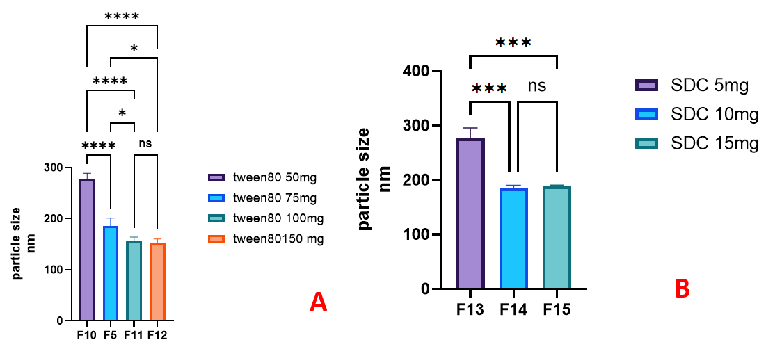 Fig. 5: The impact of edge activatorsamounton FLC-loaded spanethosomes vesicles size, (A) tween 80and (B) sodium deoxycholate (SDC), (ns,*, ** and *** represent non-significant, P<0.05, P<0.01 and P<0.001, respectively), n=3, mean values±SD