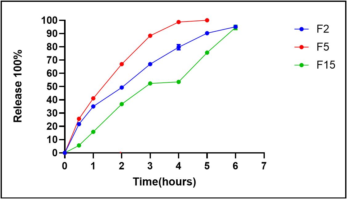 Based on the criteria of EE% greater than 90%, vesicles size less than 300 nm and PDI below 0.3 for the collected data (table 2), the formulations F2, F5 and F15 were selected for comparison their dissolution profiles.