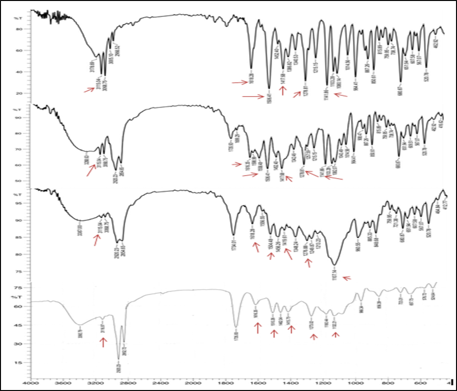 Fig. 7: The FTIR spactra of FLC, physical mixture of FLC: span 60: tween 80, physical mixture of FLC: span 60: SDC and formula F15 for up to down, respectively