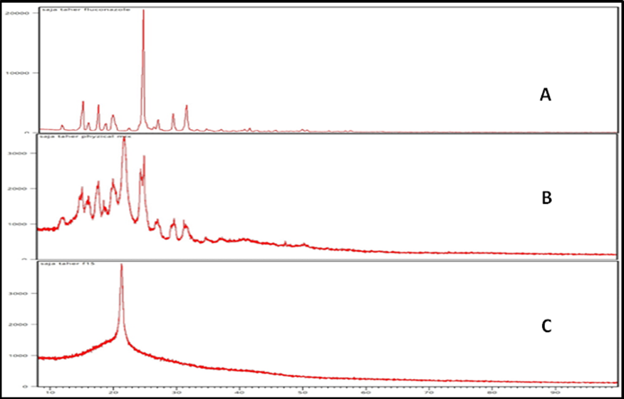 The characteristic X-ray diffraction (XRD) patterns of FLC were compared with those of its physical mixture and the final formulation (F15), as illustrated in fig. 8. The diffraction pattern of pure FLC showed sharp peaks at 2θ angles of 14.93°, 17.39°, 19.5°, 24.55°, 26.91°, and 29.31°, indicating its crystalline nature. These findings are in agreement with the previous report by Modha et al. [47]. The diffractogram of the physical mixture exhibited all the characteristic peaks of FLC, albeit with reduced intensity, indicating no significant change in the drug’s crystallinity. Additionally, a new peak appeared in the physical mixture, which may be attributed to Span 60, as reported by Yassin GE et al. [48]. Meanwhile, the diffractogram of formulation F15 demonstrated the complete absence of the sharp crystalline peaks of FLC except for a broad peak around 21° (2θ). This confirms the transformation of FLC from its crystalline form to an amorphous state, likely encapsulated within the vesicular system. These results are consistent with previous findings [49].
