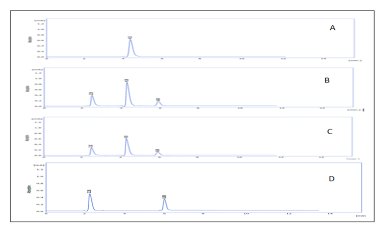 Fig. 9: The HPLC chromatograms: (A) Pure FLC, (B) Fresh F15 formulation, (C) F15 after 3 mo of storage at room temperature, (D) Blank F15