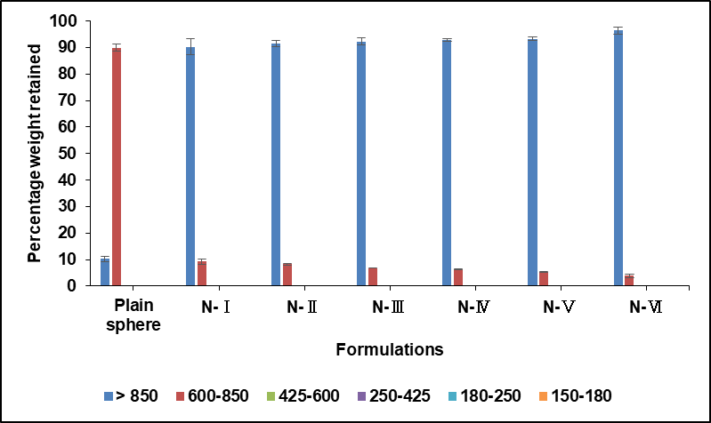 Sieve analysis was performed to determine the size of coated MUPS. 50 gm of the coated pellets were weighed and then transferred onto a stacked series of sieves. A mechanical shaker (Retsch AS-200) was then used to shake these sieves for 10 min at an amplitude of 50. Following shaking, each sieve's retained pellets were weighed independently [36, 37].