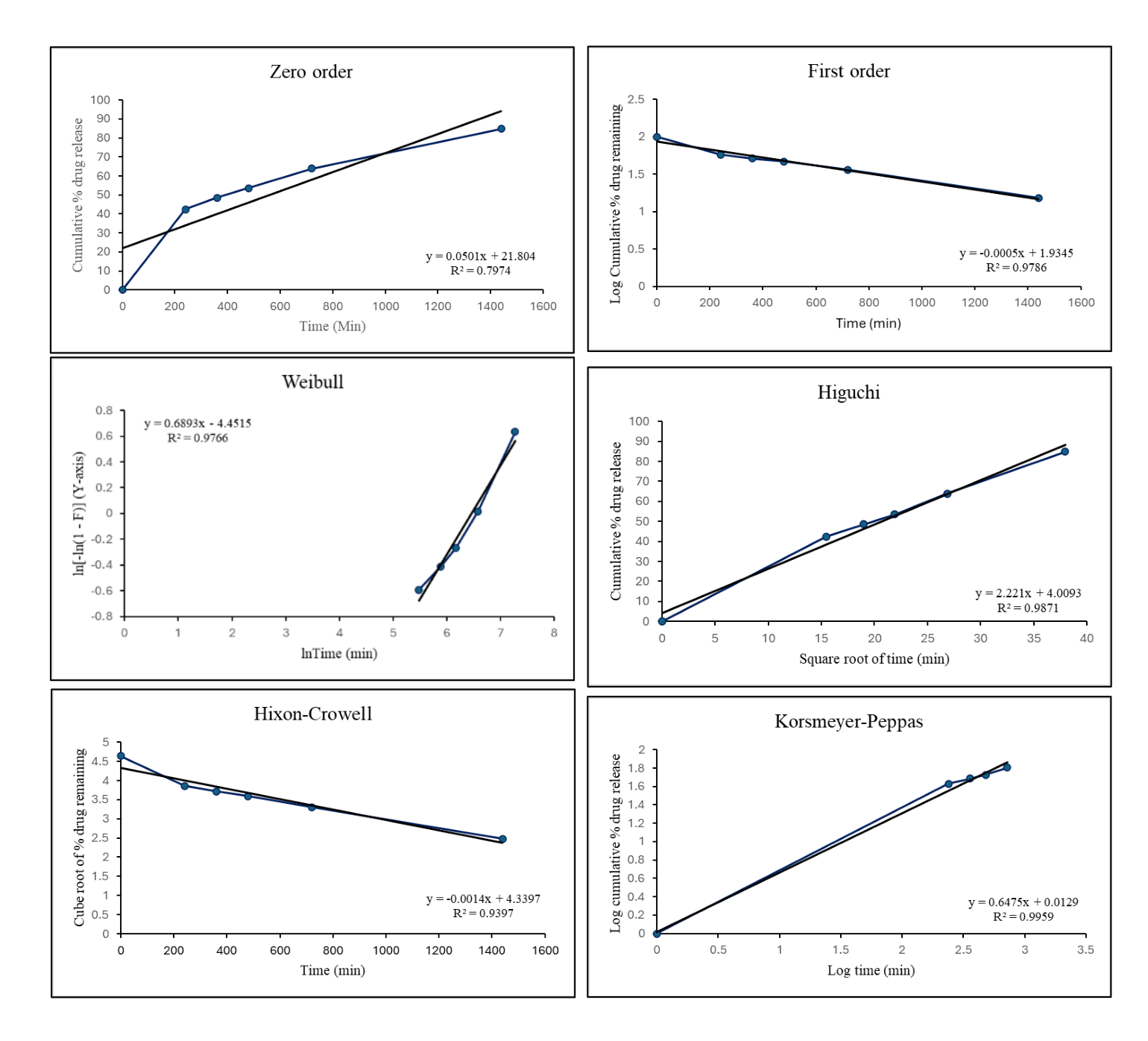 | 4. | Korsmeyer-Peppas | LogQ-LogQ0 = Logk+nLogt | 1.03 | 0.995 |