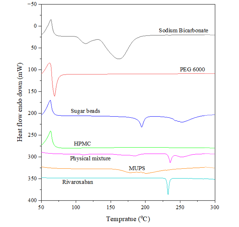 A DSC thermograph was plotted to characterize the nature of the drugs and excipients, and also to study the drug-excipient interaction. The DSC thermographs of coated MUPS, sugar beads, sodium bicarbonate, HPMC, PEG6000, rivaroxaban and their physical mixture (sugar beads+sodium bicarbonate+HPMC+PEG6000+rivaroxaban) are plotted as shown in . An endothermic peak of rivaroxaban at 232.71 °C, sugar beads at 194.37 °C and 251.2 °C, PEG 6000 at 69.25 °C and sodium bicarbonate at 113.15 °C and 161.86 °C confirmed its crystalline nature. The absence of a peak in the HPMC thermograph indicates its amorphous nature. The absence of a peak in the formulation indicates its amorphous nature due to the successful encapsulation of the rivaroxaban. The presence of sharp endothermic peaks of the drug and excipients in the physical mixture depicts no chemical interaction that might lead to any degradation of the formulation. As per the obtained thermogram, it was concluded drug and excipients were pure and free from impurities.