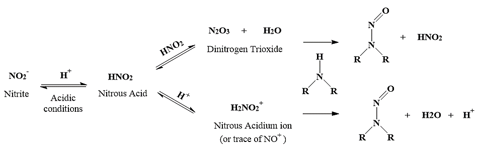 Mirvish SS. Formation of N-nitroso compounds: chemistry kinetics and in vivo occurrence. Toxicol Appl Pharmacol. 1975;31(3):325-51. doi: 10.1016/0041-008X(75)90255-0, PMID 238307.