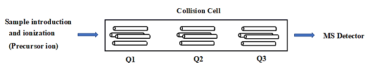 Fig. 3: Mass spectrometry general setup and MRM principle (Triple quadrupole MS), Q1: Selective transmission of ions for specific precursor ion (First mass analyzer), Q2: MSMS fragmentation of Precursor ion in collision cell in the presence of neutral gas, Q3: Selective transmission of fragment ion (Second mass analyzer)