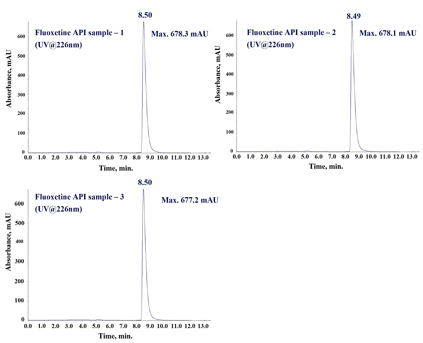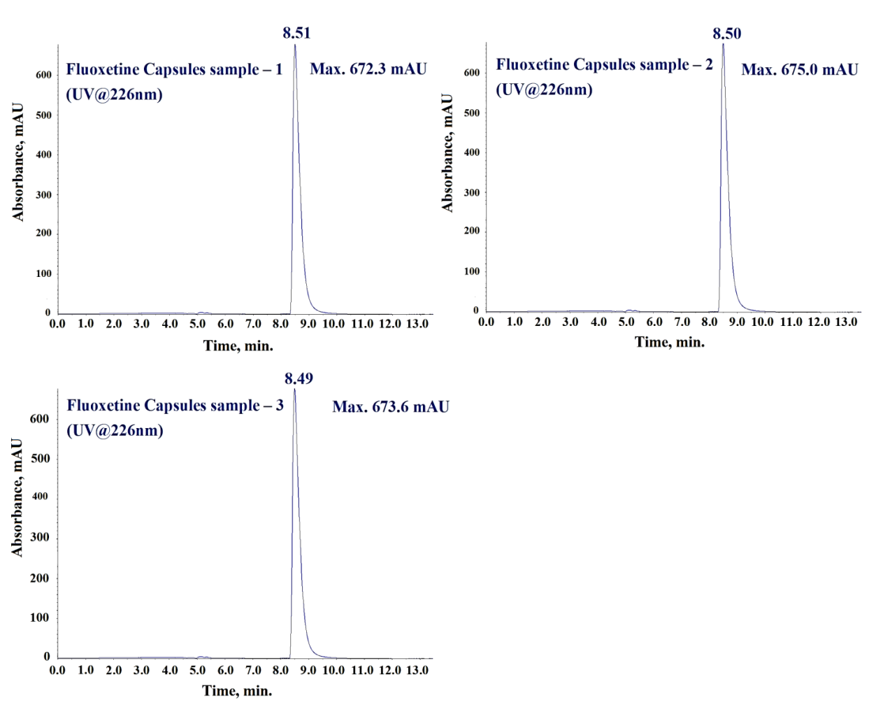 To assess accuracy, we added a known amount of impurity to the sample solution and calculated the recovered amount. Accuracy studies were conducted on fluoxetine capsules at four specification levels: 10%, 50%, 100%, and 150% using fluoxetine Capsules (60 mg). We prepared two unspiked sample solutions and three spiked sample solutions according to the procedure and injected each preparation once.