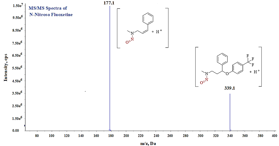 We used the AB Sciex 5500+QTRAP LC-MS/MS instrument with Analyst software version 1.7.3 to develop and validate the method. We preferred Electrospray Ionization (ESI) mode in positive polarity over atmospheric pressure chemical ionization (APCI) mode due to better ionization and response for the N-Nitroso fluoxetine impurity. The LC-MS/MS parameters were set as follows: dwell time 500 ms, curtain gas 40 psi, collision gas (CAD) 7 psi, ion spray voltage (IS) 5500 V, temperature 500 °C, and ion source gases GS1 and GS2 at 50 psi each. We used MRM mode with a parent ion of m/z 339.1 and a product ion of m/z 177.1 to quantify N-Nitroso fluoxetine in fluoxetine capsules. To achieve optimal response, we selected compound-specific MS parameters as follows: collision energy (CE) 13 V, collision cell exit potential (CXP) 10 V, declustering potential (DP) 75 V, and entrance potential (EP) 10 V.