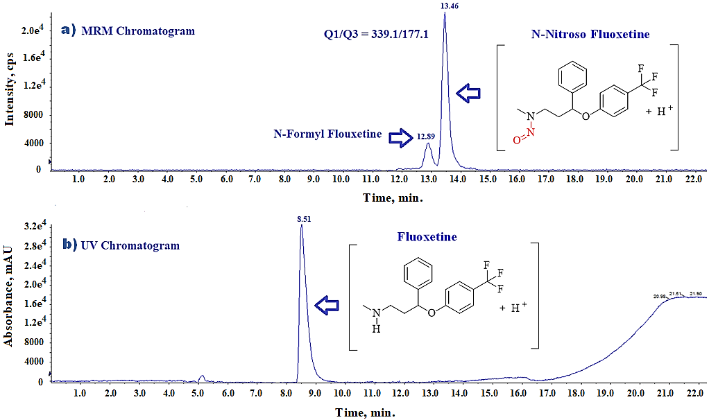 Fig. 8: (a) LC-MS/MS-MRM chromatogram of N-Nitroso fluoxetine impurity in spiked sample at 100%level, (b) UV Chromatogram of same fluoxetine sample