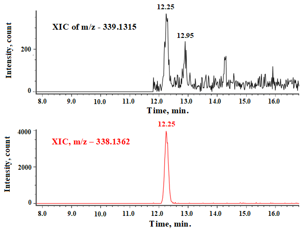 Whereas, Extracted-ion chromatogram of N-Nitroso fluoxetine (339.1315 [M+H]+) in fluoxetine API sample solution (Conc.-200 mg/ml) shows two distinct peaks at 12.25 min and 12.95 min (fig. 10).