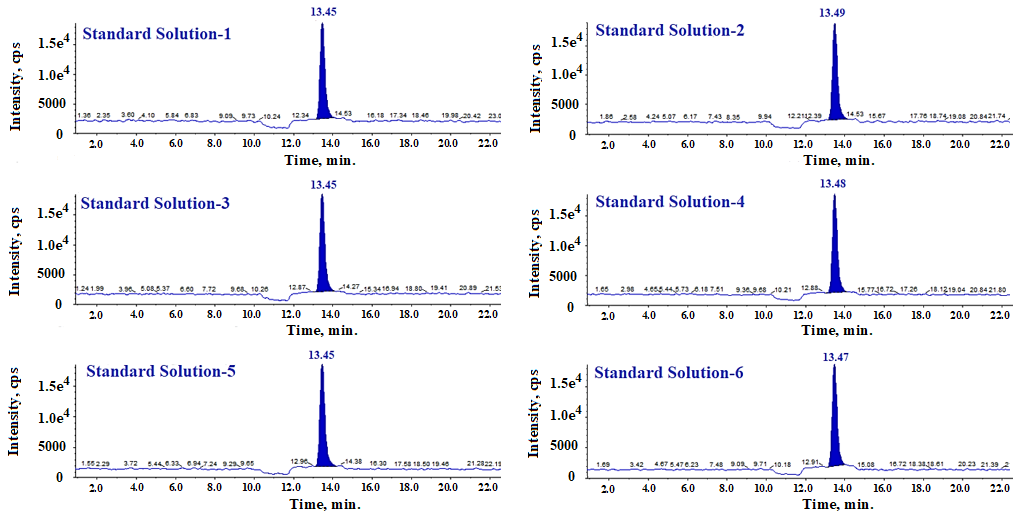 We injected the diluent once, followed by six injections of the standard solution and one injection of the test solution into the LC-MS/MS system, then recorded the peak responses to calculate the impurity content in the sample.