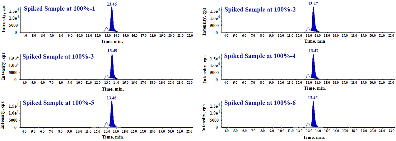 We prepared six spiked test sample solutions at the 100% level and analyzed them according to the established procedure, where impurity content is calculated in each solution to evaluate the consistency of measurements obtained under identical analytical conditions.