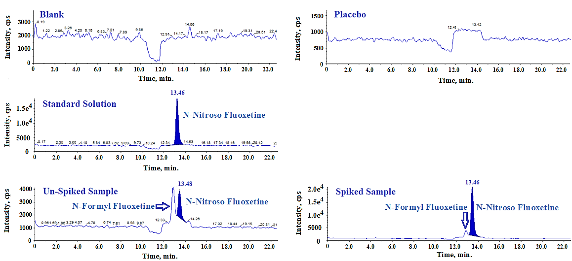 We analyzed several batches of fluoxetine capsules (60 mg) to estimate the N-Nitroso fluoxetine impurity content, and the method was found to be suitable for the analysis.