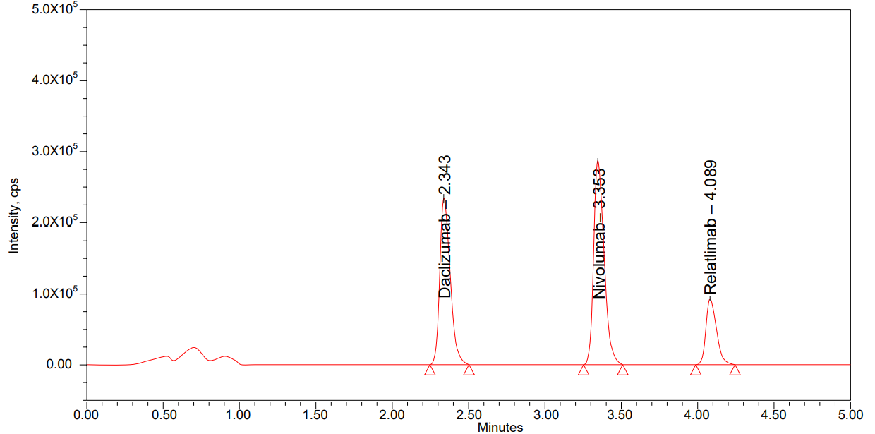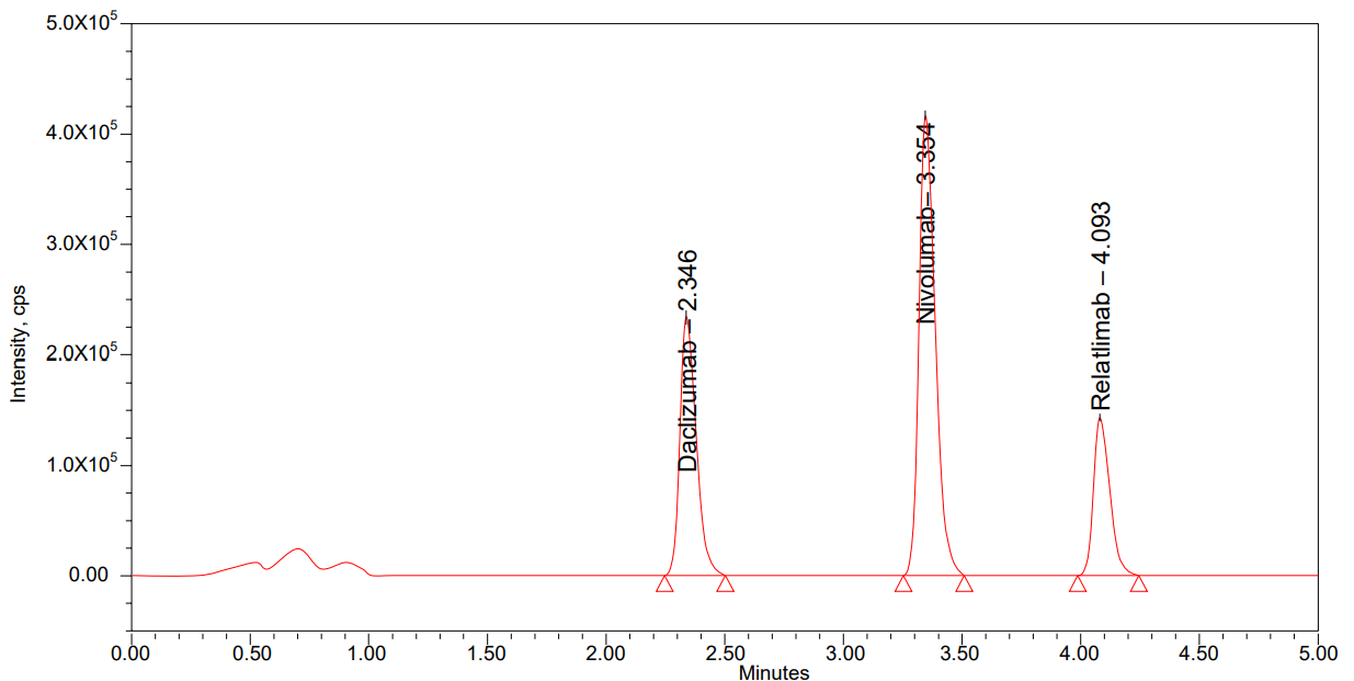 Linearity solutions [12] were prepared across a concentration range of 12 to 480 ng/ml for nivolumab and 4 to 160 ng/ml for relatlimab. The prepared samples were centrifuged at 4000 RCF for 20 min. The resulting supernatant was collected into LC vials and analyzed using the chromatographic system.