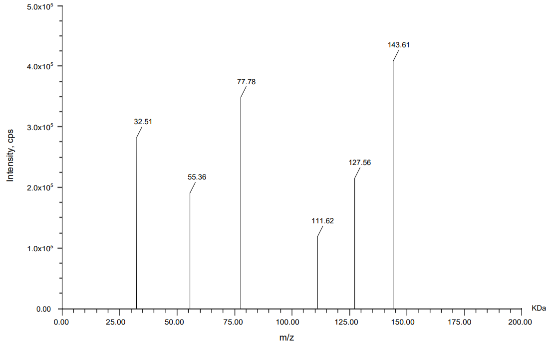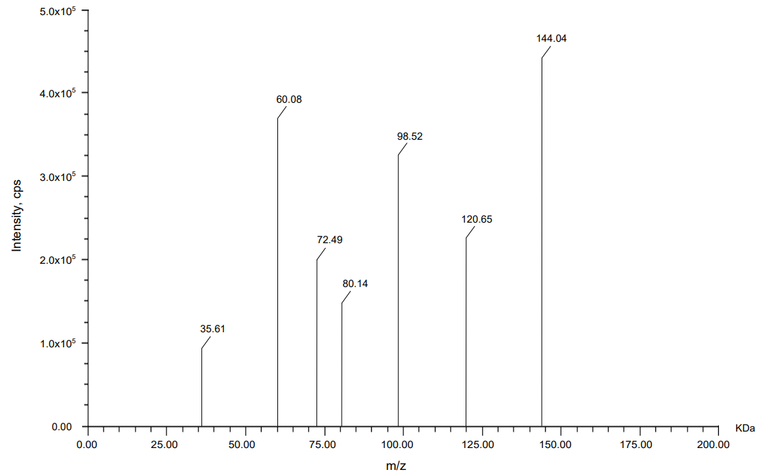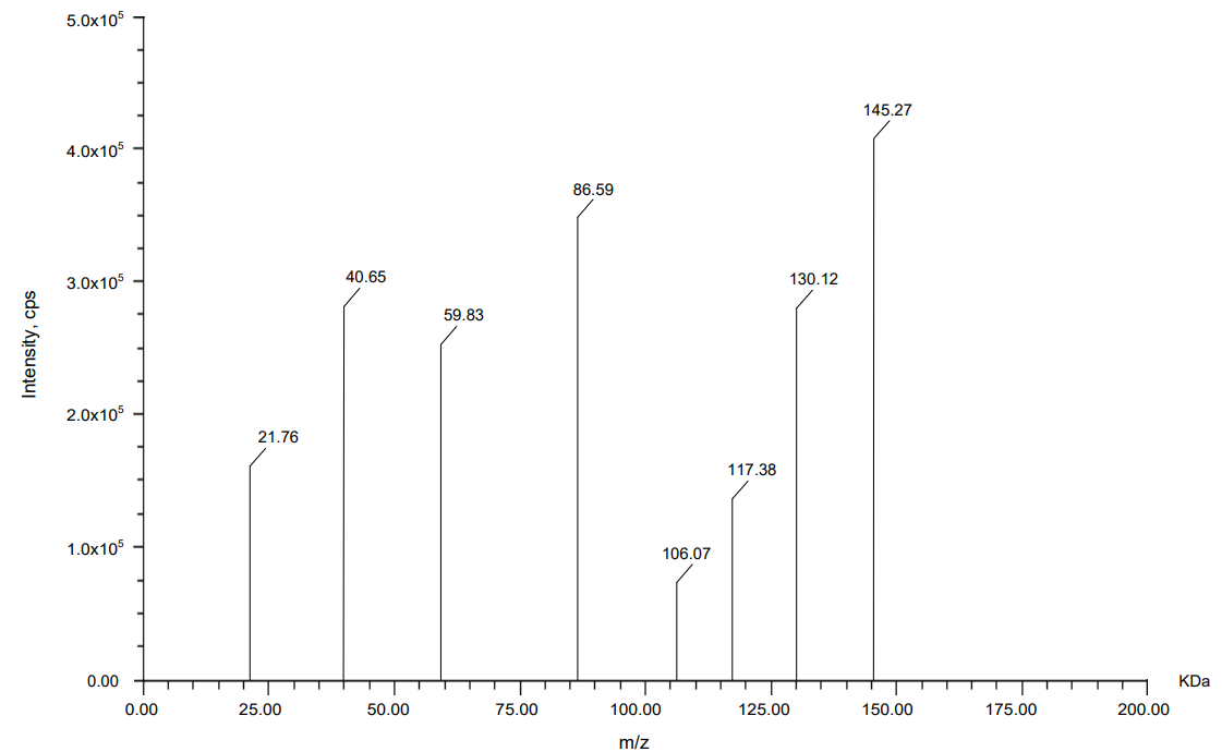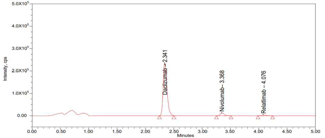 Mass spectrometric analysis using MALDI-TOF was carried out to compare the molecular fragment profiles of two therapeutic monoclonal antibodies, nivolumab and relatlimab, using daclizumab as an IS. According to the data obtained from fig. 13, 14, 15 daclizumab displayed a consistent parent ion peak at m/z 144.04 and a corresponding fragment ion at m/z 60.08, serving as a benchmark for spectral calibration and comparative evaluation. Nivolumab exhibited a distinct fragmentation profile, with a major ion at m/z 143.61 and a prominent daughter peak at m/z 77.78, suggesting the generation of a stable, low-mass product, potentially arising from the cleavage of a structurally rigid region. Relatlimab presented a parent ion at m/z 145.27 and a corresponding fragment at m/z 86.59, indicative of a partial molecular dissociation with retention of a significant portion of the original mass. The differences in fragment ion masses among the antibodies reflect structural variability and potentially differential fragmentation behavior under laser desorption conditions. These data support the use of MALDI-TOF for qualitative comparison and characterization of monoclonal antibodies, with daclizumab providing a reliable internal control for peak alignment and intensity normalization.