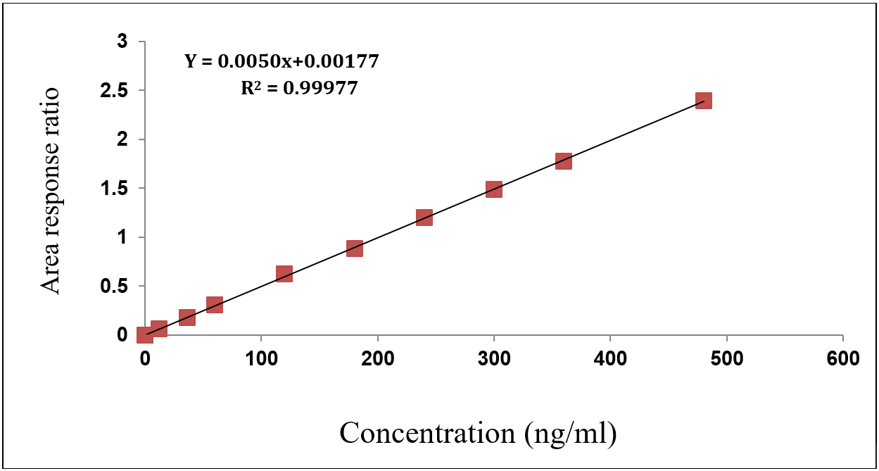 The method showed excellent linearity [18] over the calibration range of 12-480 ng/ml for nivolumab and 4-160 ngm/ml for relatlimab as mentioned in the fig. 6 and 7. Calibration curves constructed by plotting the peak area ratios of each analyte to their respective internal standards yielded correlation coefficients (r²) greater than 0.998 for both compounds across three validation batches as depicted in the table 6 and 7 The slopes and intercepts were consistent, confirming the reproducibility and proportionality of response to analyte concentration, was showed in the fig. 6 and 7.