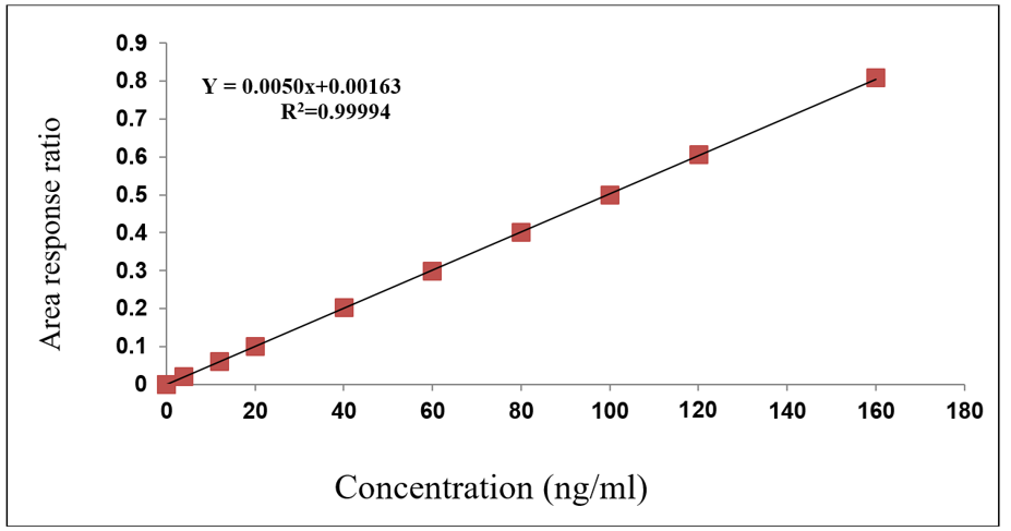 Chromatographic analysis was conducted using a Waters 2695 HPLC system equipped with a high-speed auto sampler, column oven, and degasser. Detection was performed using a SCIEX QTRAP 5500 mass spectrometer [11], operated with Analyst software from AB SCIEX for data acquisition and processing. Working parameters of mass spectrometry after optimization as follows: Ion spray voltage 5500 V; Temperature source 550 °C; Drying gas temperature 120-250 °C; Collision gas-Nitrogen; Pressure 55 psi; Drying gas flow stream-5 ml/min; Declustering potential-40V; Entrance potential-45V; Exit potential-15V; Capillary voltage-5500 V and Dwell time 1 sec respectively.