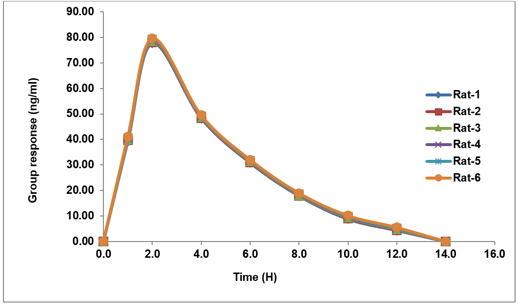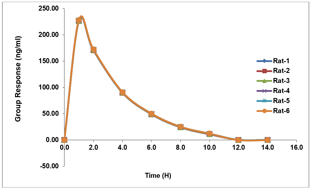 Following a single-dose administration, blood samples were collected from six rats at 1, 2, 4, 6, 8, 10, 12, and 14 h post-dosing, along with a predose sample. Plasma was separated via centrifugation and stored at −70±10 °C. Quality Control (QC) samples at four concentrations were processed alongside study samples. PK parameters were calculated using WinNonlin (v5.2). Sample stability was confirmed through Incurred Sample Reanalysis (ISR), where repeat measurements of Cmax and elimination-phase samples showed ≤20% deviation from initial results.