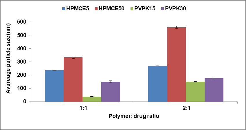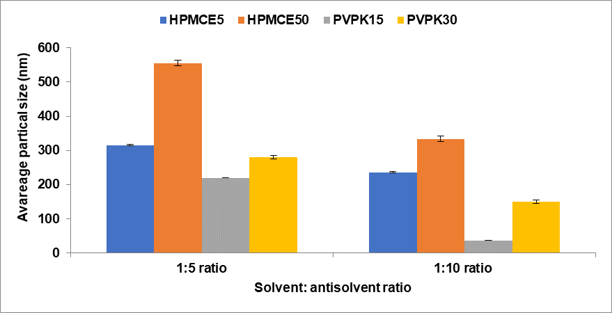The effects of changing the ratio of injected drug solvent solution to stabilizer antisolvent solution on the mean size of the nanoparticles formed for all polymers type was shown in fig. 2. It has been shown that the solvent: antisolvent ratio (1:10) led to a remarkable decrease in the size of the prepared CC nanoparticles and this may attributed to faster supersaturation and rapid neucleation that dominates over crystal growth [28].