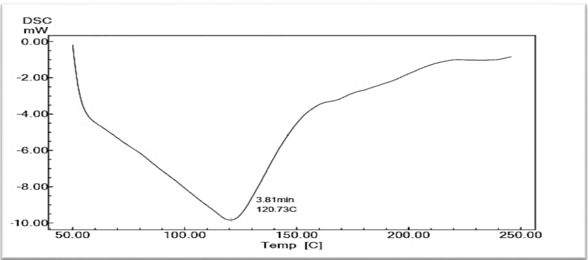 The differential scanning calorimetry of candesartan showed sharp endothermic peak at 171.5 °C which is near to its melting point that represent the crystalline state of drug as showed in fig. 5. [29]. While, the DSC of FCC3 formula indicated to a reduced intensity of peak and temperature in comparison to raw drug and polymer as in fig. 6 and 7. These results indicate the decrease of crystallinity percent of drug and/or translate to amorphous form that enhances solubility of drug.
