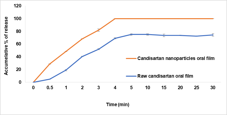 The oral thin films of CC nanoparticles where tested for dissolution profile using 500 ml simulated saliva at 50rpm and 37 °C and compared with oral film of raw candesartan as shown in fig. 15. The percent of release in one minutes and time to reach 100% of release this comparison were done between film prepared from CC nanoparticles and other prepared from raw candesartan. The cumulative proportion of CC released from a film that contains nanoparticles of CC in one minute and three minute was 49% and 82 % respectively, and reach to 100% at time 4 min. Conversely, cumulative percent of release of pure CC film in one minute and three minute was 19% and 52 % respectively, and where failed to achieve full release (100%) because pure drug was not well dissolved in artificial saliva, so this rate limiting step reason for low bioavailability of candesartan, while oral film containing candesartan nanoparticles provided the best dissolution profile and significant quick release. From these result showed a very rapid disintegration of cc nanoparticles oral film (25s), indicating that the polymeric matrix is not limiting factor for drug release. However, the subsequent nanoparticles release and dissolution government the overall release profile, as reflected by 68% drug release after two minutes. Therefore the dissolution process of cc oral film is rate limiting step [34].