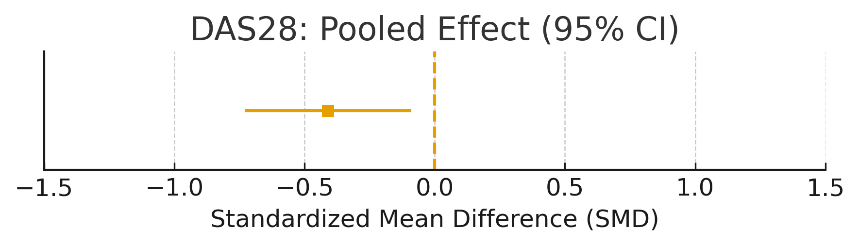 | DAS28 | 6 | –0.39 [–0.71, –0.07] | 0.017 | 46.4 | Modest clinical improvement | |