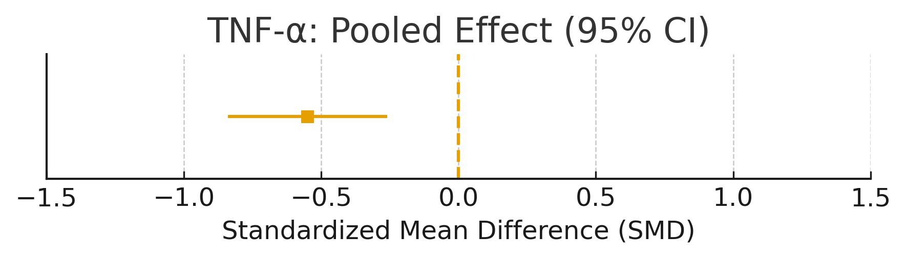 | TNF-α | 7 | 513 | -0.55 | [-0.84,-0.26] | 0.001 | 51.9 | Reduction in pro-inflammatory cytokine | TNF-α | 7 |