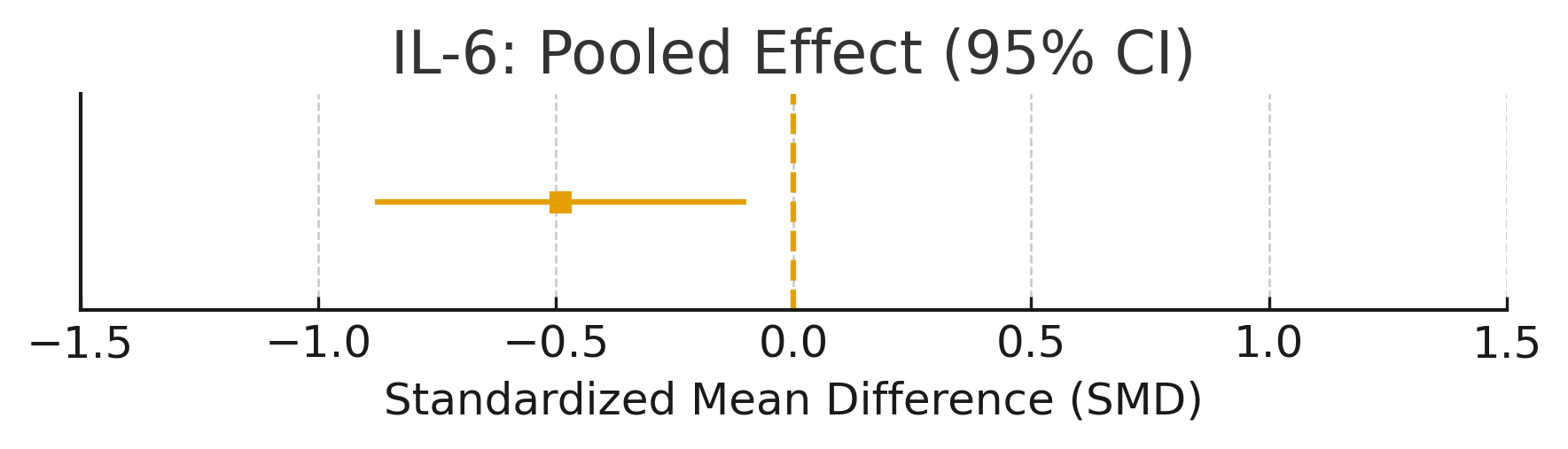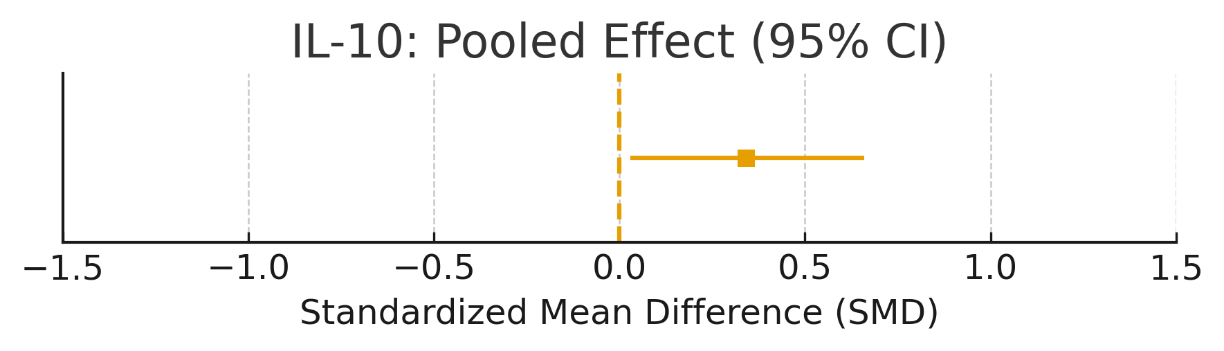 | IL-10 | 5 | 386 | +0.34 | [0.03, 0.66] | 0.030 | 39.7 | Anti-inflammatory cytokine increased |