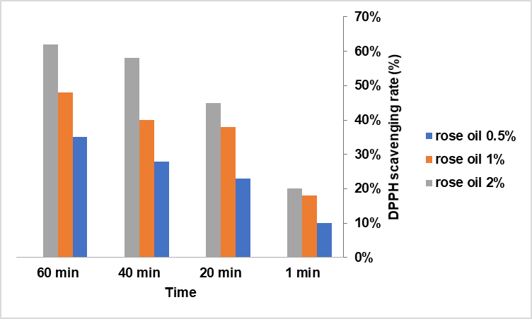 The antioxidant activity of the films increased proportionally with rose oil concentration (fig. 3). DPPH radical inhibition was 35±2% for 0.5%, 48±3% for 1.0%, and 62±4% for 2.0% rose oil.